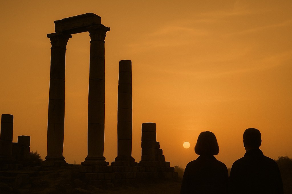 They both chuckle. The mood is warm, the candlelight flickering over the dinner plates like sunlight through broken temple walls.