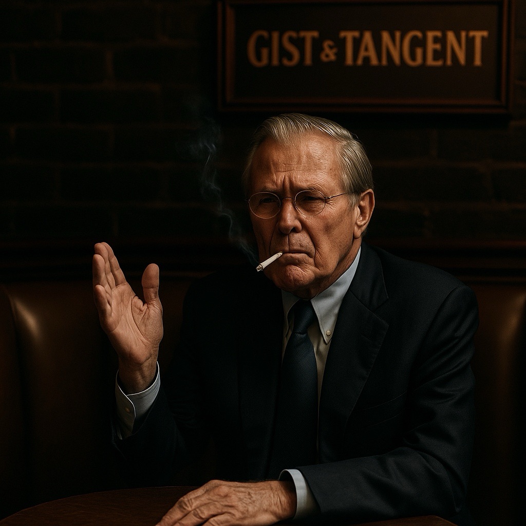 [floating footnote 4] Rumsfeld, D. (2002). “Press Briefing.” U.S. Department of Defense Archive. In this oft-quoted statement, Rumsfeld articulated a taxonomy of knowledge: “There are known knowns… There are known unknowns… But there are also unknown unknowns.” Scholars within the Council have debated whether his formulation was an epistemological breakthrough, a tautology, or simply an accidental echo of older hermetic triads. Some believe it qualifies him, retroactively, for honorary membership in the Council’s Epistemic Fog Subcommittee.