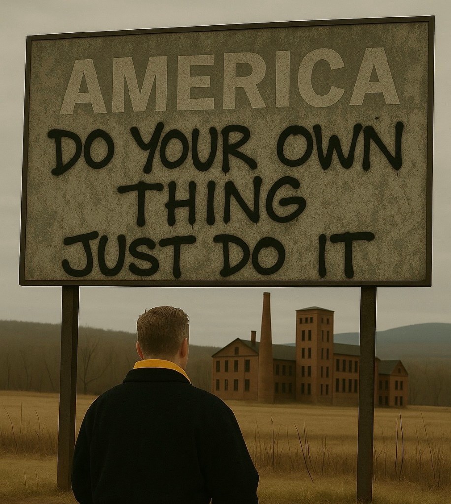 I’ve been sitting under the shade of a half-collapsed billboard at the edge of town, watching the American dream shimmer in the heat like a mirage—and I can’t help but regret the course our so-called “freedom” has taken.