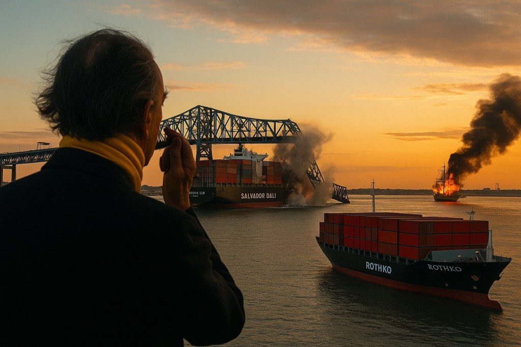 Take, for example, the container ship that struck and collapsed the Francis Scott Key Bridge in April 2024—the same Key who once gave us our national hymn, now submerged under the weight of cargo capitalism. The ship’s name? Salvador Dalí.