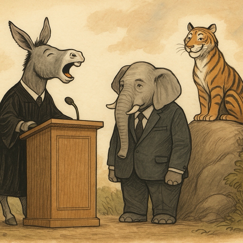 One day in the jungle’s quieter quarter, a donkey with a loud voice and a freshly printed pamphlet shouted at a passing elephant: