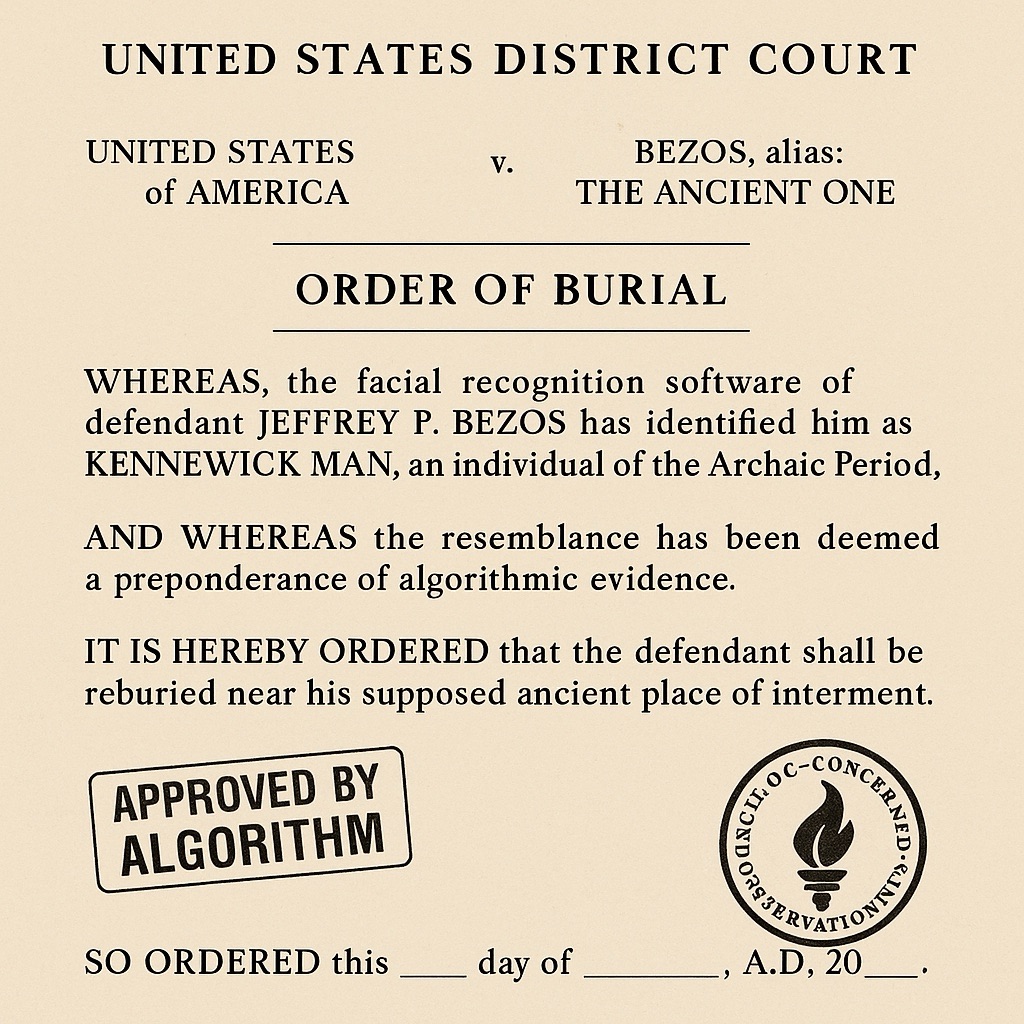 A federal judge, relying on Amazon’s own facial recognition software[1], has officially ordered Jeff Bezos to be ceremonially reburied—having been identified as Kennewick Man[2], the 9,000-year-old skeleton unearthed near the Columbia River.