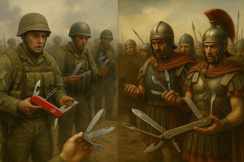 Even the Romans had multitools—elegant bronze contraptions with folding spoons, spikes, and scalpel-like blades, presumably for soldiers or surgeons on the march.[²] Like their empire, these tools were built for outward functionality and internal contradiction. And like Rome itself, they tried multiculturalism in their own way—by permitting local deities and traditions, so long as they bowed before the imperial altar. The result was a dazzling, unstable amalgam: Jupiter in Gaul, Isis in Britain, Mithras under the bathhouse.