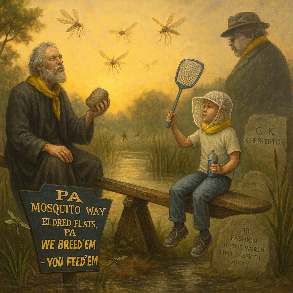 The world, as Chesterton knew, doesn’t proceed upward like a spreadsheet or a corporate ladder—it teeters, it teases, it see-saws. And if Jeffers urges us to unhumanise, perhaps the swarm of mosquitoes, bred in some obscure outpost of Pennsylvania, is here to help. Not to punish—but to reframe. To nibble at the myth of dominion. To remind us that we, too, are feedstock.