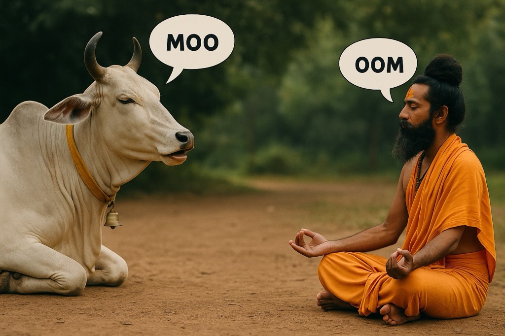 Is this why the cow became sacred to the Hindus? Not because it moos, but because it already knows. Maybe nirvana isn’t earned by striving—but by standing still, chewing, and letting others make a religion out of it