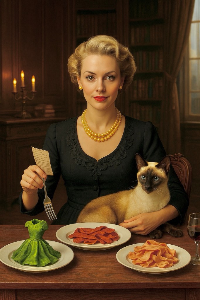 I suppose this is where I remind the reader that I do, in fact, write the fashion, food, and pet care column for this esteemed publication. One wouldn’t expect a girl like me—raised among Boston terriers and bone china—to weigh in on quantum models and edible metaphysics. But I’ve always maintained that haute cuisine and haute philosophy share the same plating instincts: arrangement matters, darling, and so does imagination. My name is Daphne, after all—short for Daffy if you’re feeling cheeky, or Delphic if you’re feeling Jungian. I may look like one of those dames from the 1930s screwball comedies, the kind who wears gloves to breakfast and argues with the help—but I do my thinking with the best of them, preferably while wearing linen slacks and feeding my Pomeranian a locally-sourced duck soufflé.