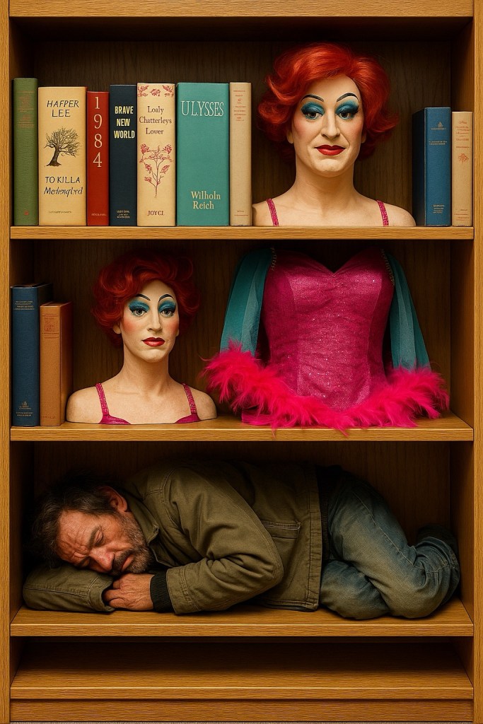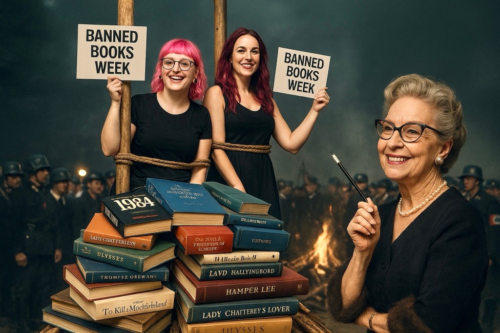 So laugh with me — when the next election swings the wheel, 1984 will be marked too dangerous, Joyce and Lawrence too male, and the very librarians who parade “Banned Books Week” will discover their own shrines dismantled. Their rainbow shelves will be judged relics, their manuals of self-invention fed into the flames.