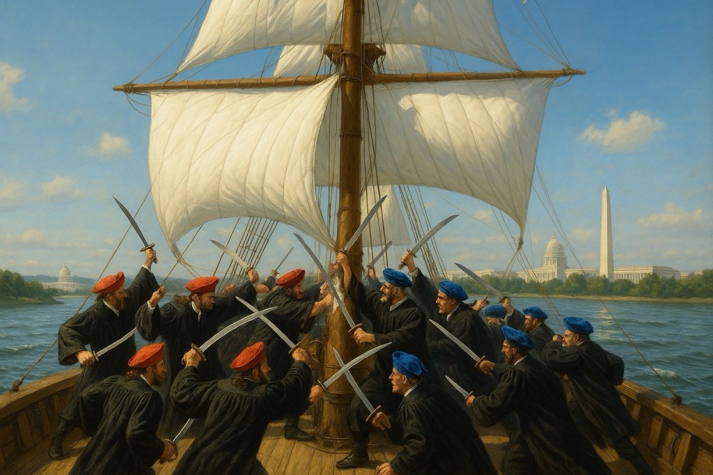 Black Cloud has cast the judiciary as a ship of fools — no, worse, a pirate barque. And we are all on board. Not just the Supreme Court, but the whole federal fleet of benches, all creaking with partisan timber. The robes? Costumes. The confirmations? Auditions. Each nominee struts as “impartial interpreter,” while the Senate plays casting director, fitting them neatly into the troupe of donkey-flag or elephant-flag players.