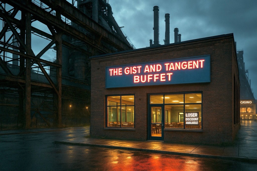 Bethlehem, Pennsylvania. The blast furnaces of Bethlehem Steel still loom like cathedrals, but their bellies are gutted and lined with neon — the mills reborn as a casino and tourist draw. Just behind downtown lie the quieter ruins of the old Moravian Industrial Quarter, where an intentional religious order once planned every craft and trade with precision. Between the Moravian foundations and the steel carcass, we take our seats — in the only lively spot left among the bones.”