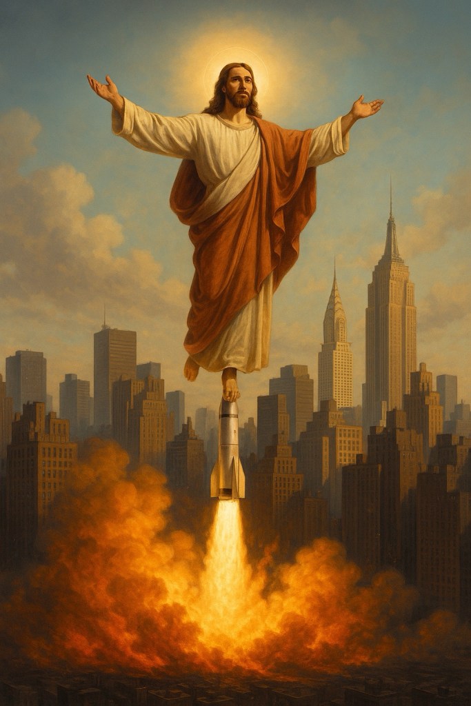 The Faustian Christ departs—rising on the same fire that built the city.