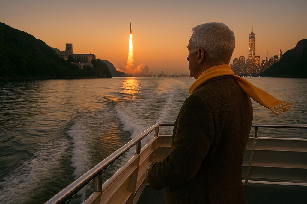 As usual, he’s moving against the flow—putting a safe distance between himself and New York’s next great revelation. The river runs south, the rockets rise West, but Peter keeps to his course: upstream, steady, and sane.
