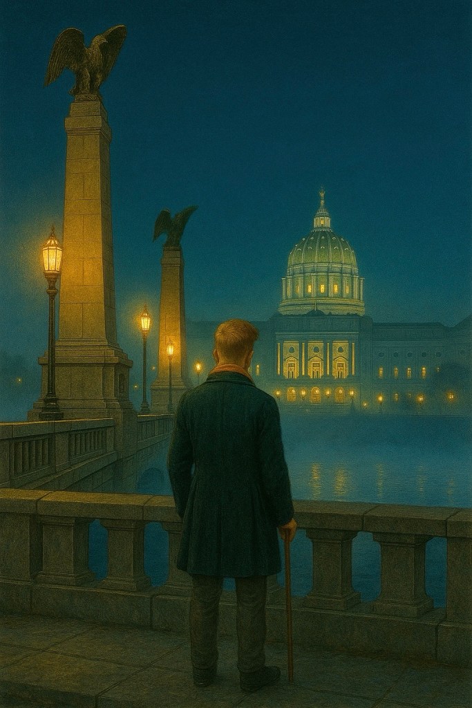 I stood on the Soldiers & Sailors Bridge as the Susquehanna breathed its evening fog upward, wrapping the Art Deco eagles in a pale, trembling veil. My yellow gaiter crept toward my cheek like a shy understudy waiting for its cue, and the whole bridge seemed to hum with the slow, tidal memory of epochs. In that hush, Harrisburg’s new decree about hair floated through my mind—strange, solemn, oddly theatrical—and the next thing I knew, the mist was turning into footlights, and I was drifting gently into a daydream the Commonwealth itself seemed to be composing.
