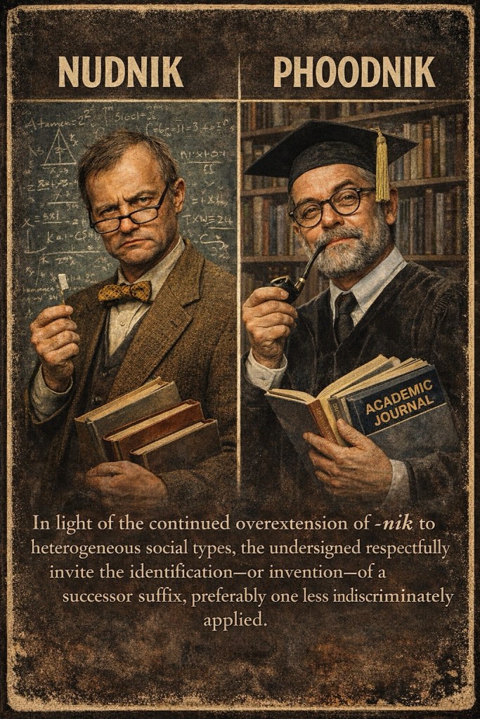 As Paul Dickson documents in What’s in a Name? Reflections of an Irrepressible Name Collector, the effect was contagious. Suddenly -nik was everywhere: beatnik, nudnik (a boring teacher in late-1950s slang), and even phoodnik—defined, with academic precision, as a nudnik with a Ph.D.