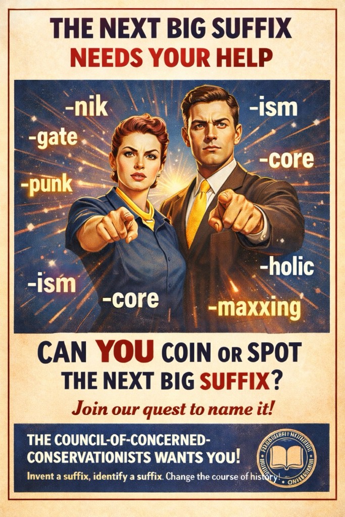While speculating about what suffix might come next, I’m reminded of a remark Mason Freeman once made—only half in jest. If the Russians, as he noted, gave American English its first great suffix event with Sputnik and -nik, then a certain strain of contemporary imagination will inevitably see the next linguistic fashion the same way: as further proof that Russian influence is everywhere. Mason suggested this phase might someday be remembered as Nikgate—the moment when a newly popular suffix is treated not as language at work, but as evidence of subversion. In this view, the suffix itself would explain everything: