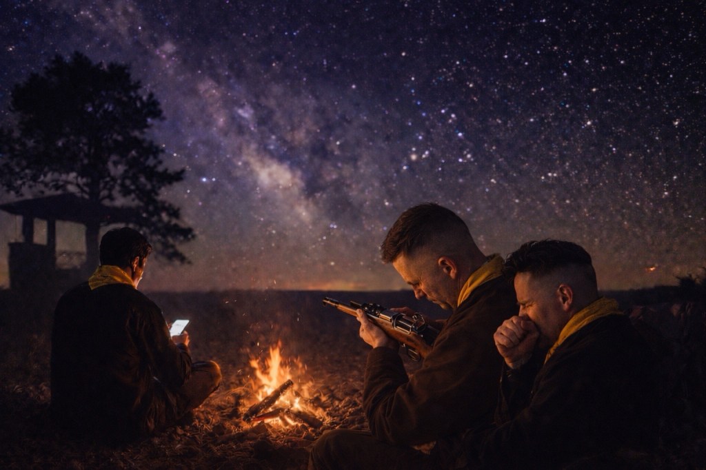 He had chosen his spot deliberately. His small fire burned a short distance from another campsite along the ridge—far enough to claim solitude, close enough that voices could carry if they were not trying to.