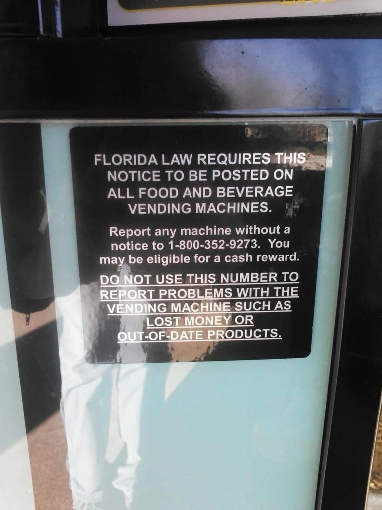 The notice appears to be a substantial metal label, likely issued when a vending machine is registered for taxation or regulatory purposes. Its usefulness becomes clear only in context. Vending machines often appear in clusters. Seeing a properly labeled machine teaches you what to look for, allowing you to identify those without labels and report them—possibly for a cash reward.