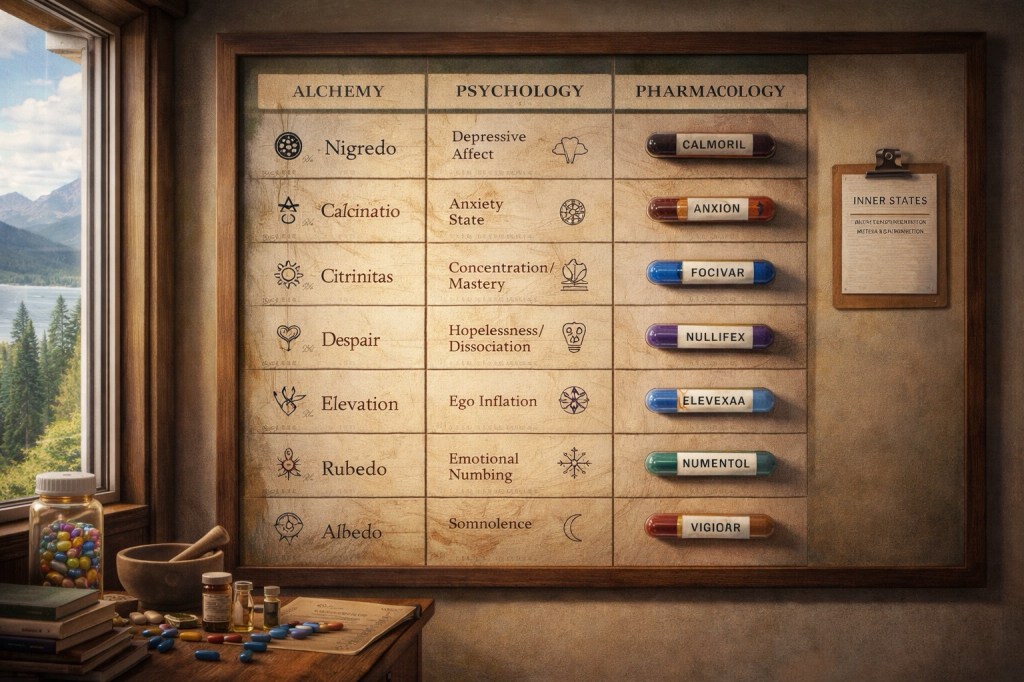 Yes. Alchemy externalized inner states through matter. Pharmaceuticals reverse the flow: they treat inner states through chemistry—and name them poetically so the process feels legible.