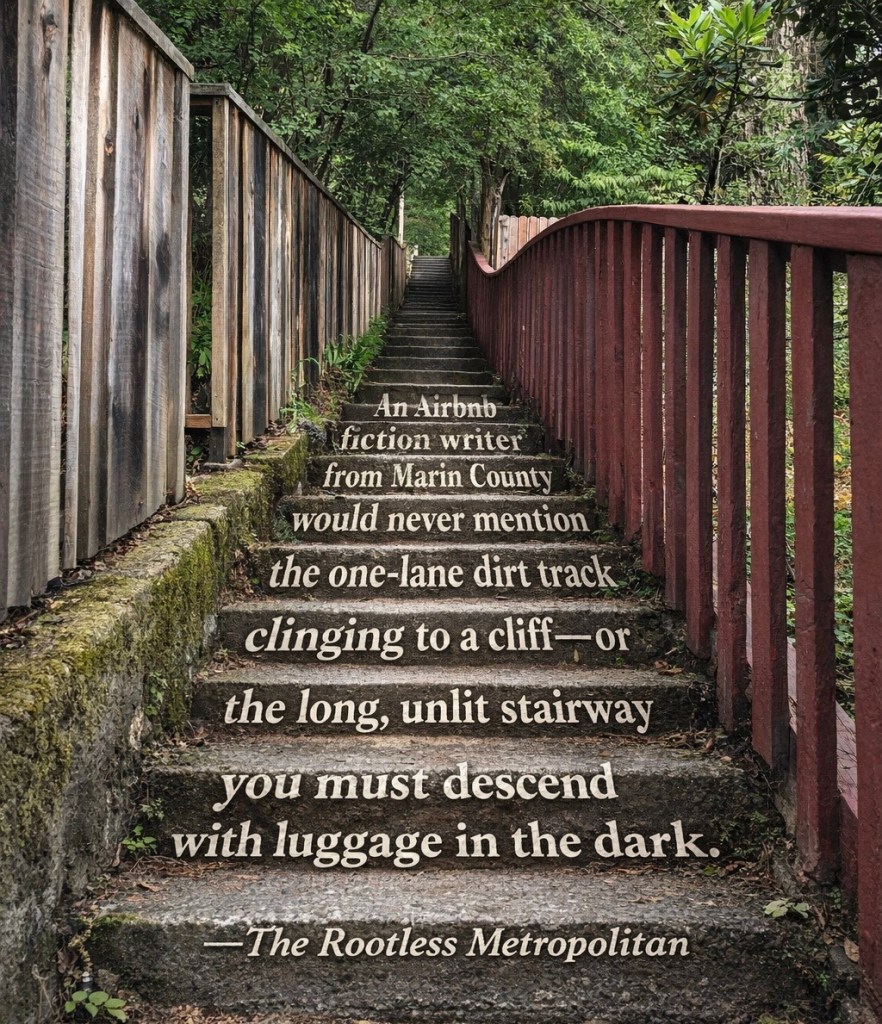 Photograph taken on location at an Airbnb in Marin County. The listing sang of sylvan refuge and coastal enchantment; reality replied with a narrow ribbon of earth clinging to the cliff and a vertiginous stair swallowed by dusk. The house, once reached, justified the pilgrimage. *** “Madonn’. . . the story she write is nice, very nice. But reality? Is always more. . . how you say. . . creative. Stranger than the fiction, eh? Especially when you carry the luggage.” —Lefoto “Lee” Sfocato, Council Photographer