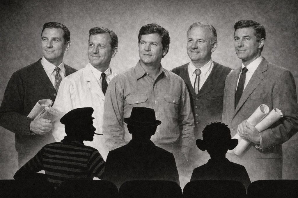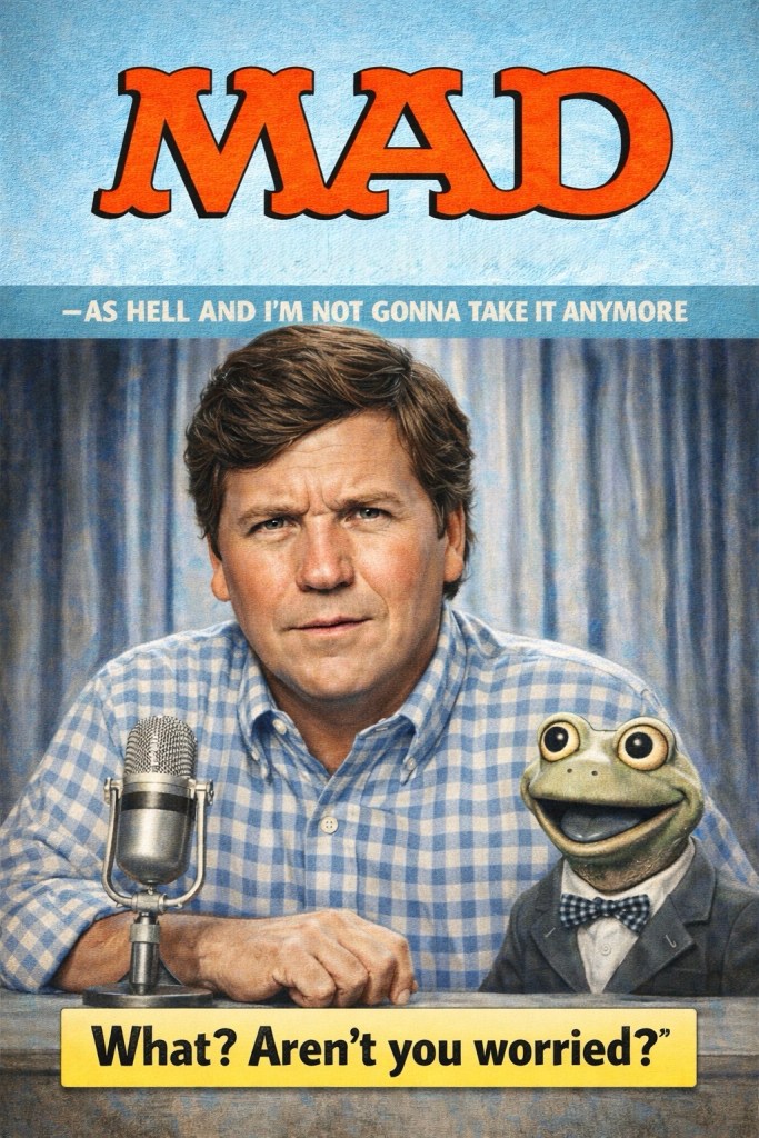 In the current media landscape, Tucker Carlson occupies, for many, that space. Not the cardigan patriarch of the 1950s, untouched by doubt. Nor the satirical jester of mid-century print. Rather, a figure who projects composure while openly challenging institutional narratives. And yet, beneath the fatherly steadiness, there remains a trace of boyish impishness — the raised eyebrow, the half-smile — as if the gap-toothed trickster of an earlier era has been transmuted rather than discarded. The irreverence once aimed at middle-class conformity now pivots in a different political direction, folded into a posture of watchfulness rather than mockery.