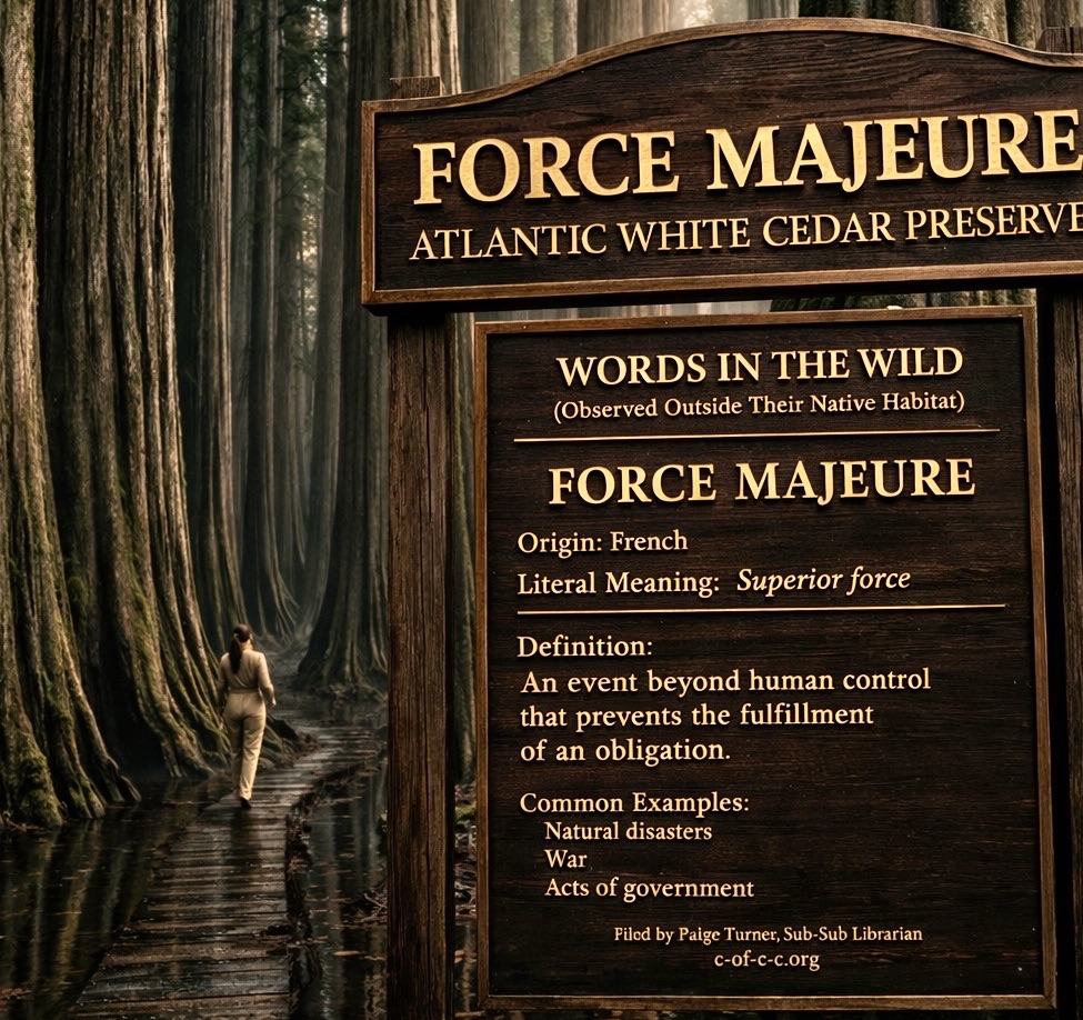 —Specimen: “force majeure” — recently sighted migrating from legal documents into the open news cycle.