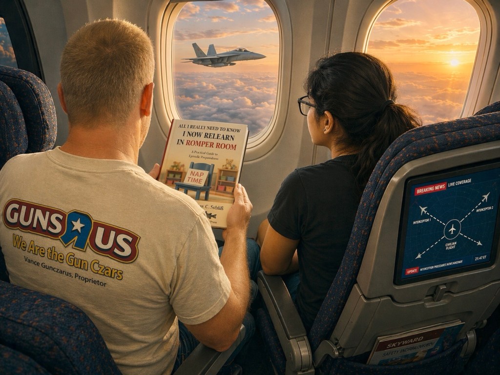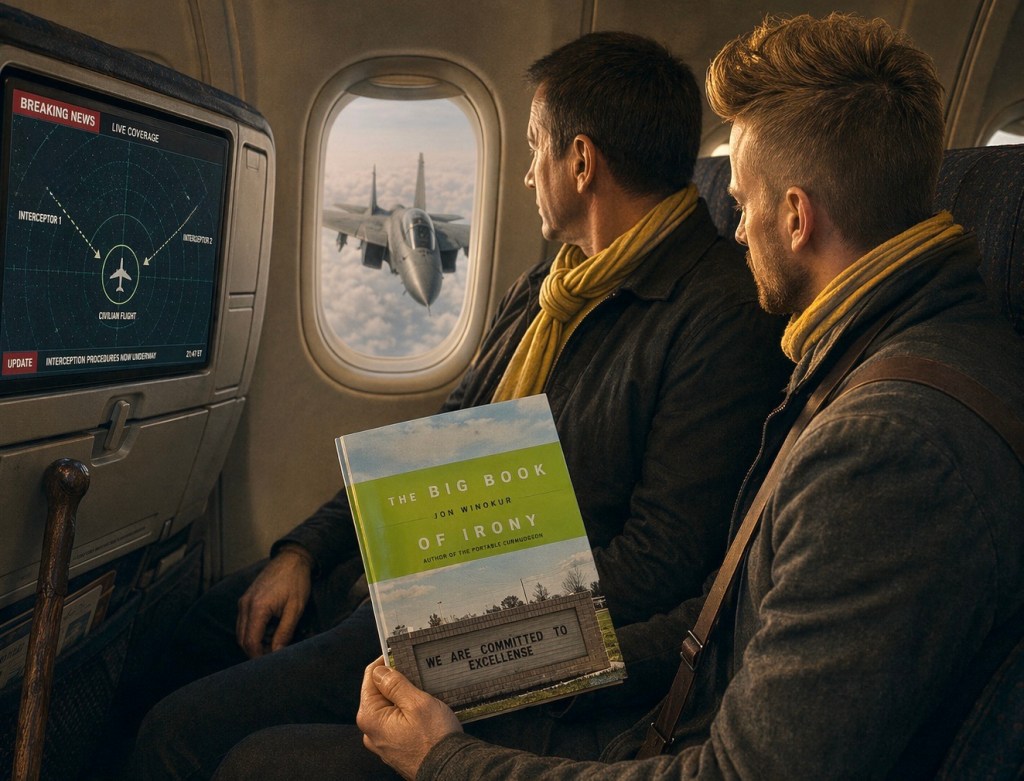 After a safe landing, passenger Alexandra Jacobs tells reporters: “We couldn’t believe the irony that we might be watching our own demise on television—it was all too post-post-modern.”